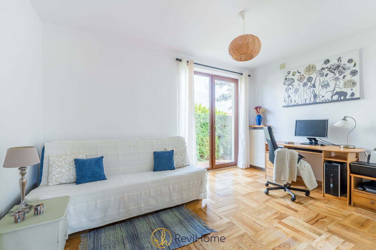 Na parterze znajdują się również gabinet mogący służyć również jako pokój gościnny, garderoba i łazienka z prysznicem i piecem gazowym dwufunkcyjnym.