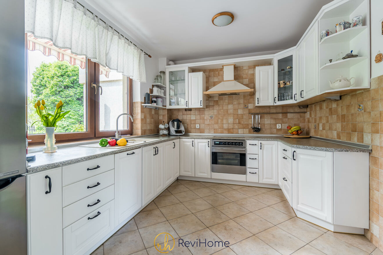 Z salonu przez jadalnię z dużym, rodzinnym stołem przechodzimy do widnej kuchni w pełni wyposażonej w sprzęt AGD (płyta elektryczna, piekarnik, lodówka, zmywarka, okap).