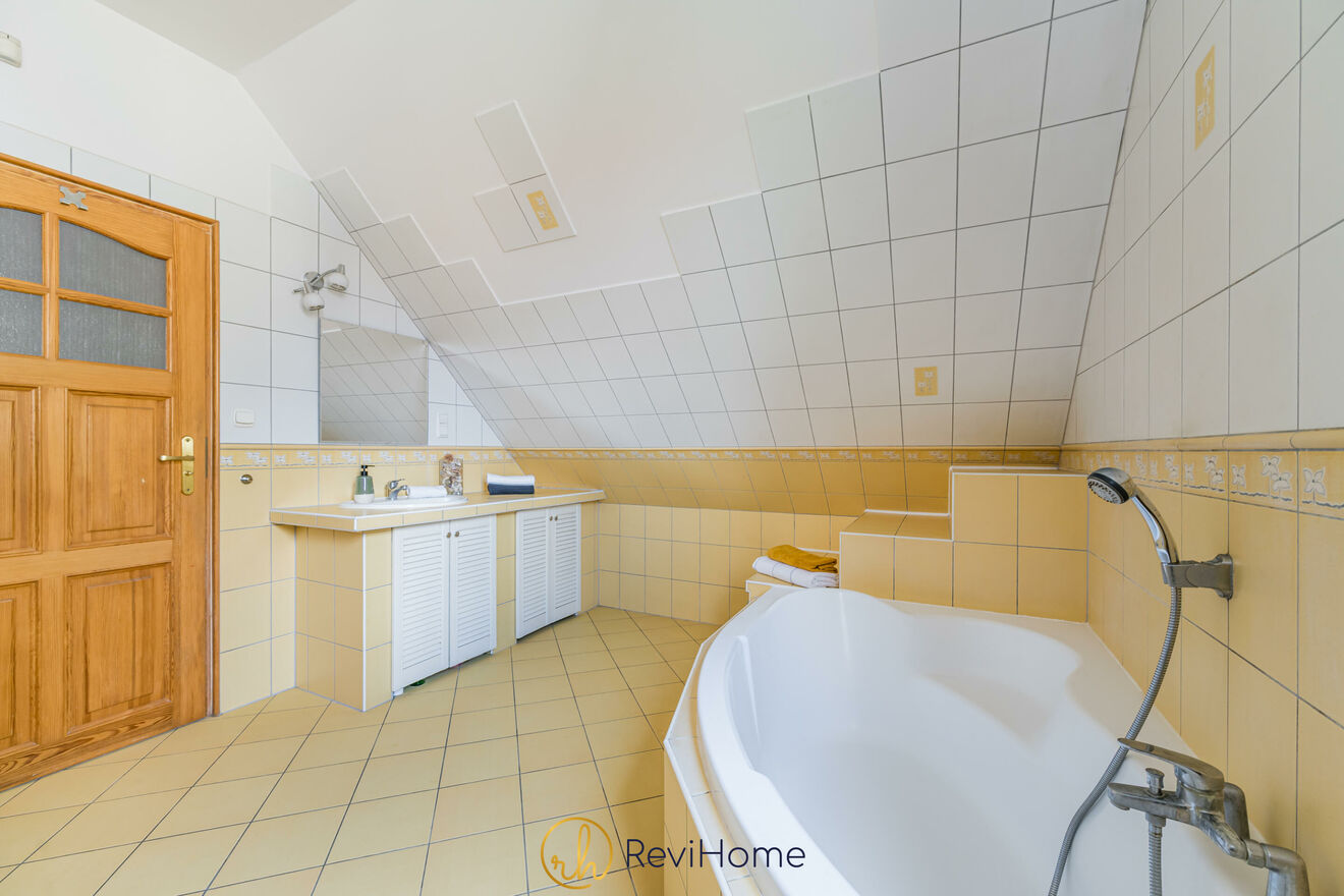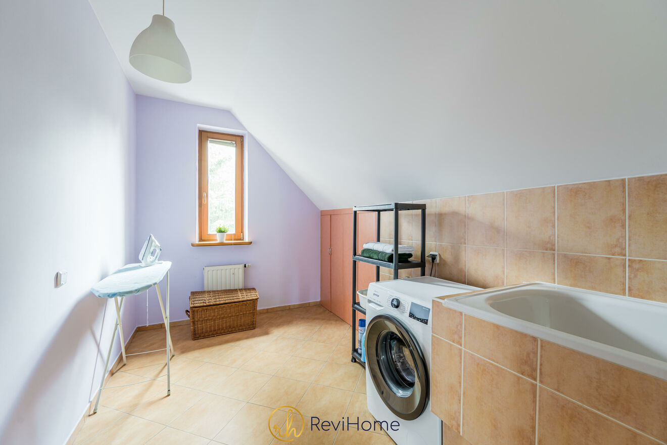 Ponadto na piętrze znajduje się również łazienka z dużą, narożną wanną oraz pralnia.