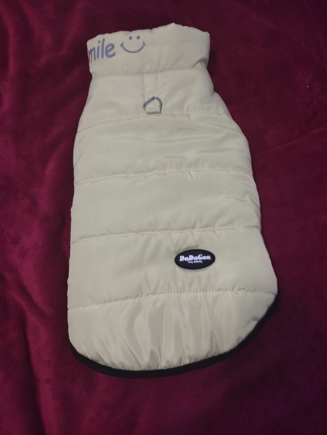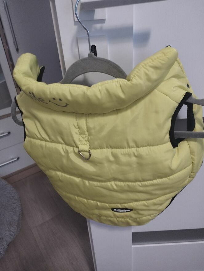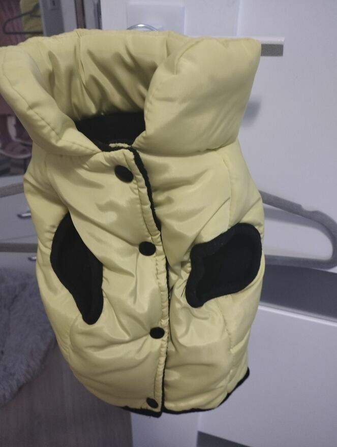 Kamizelka ocieplana polarem dla psa lub kota kolor żółty kanarkowy zapinana na zatrzaski z uchwytem na smycz rozmiar XXL. Szerokość 25 cm długość całkowita bez stójki przód 26 cm tył 38 stójka 6 cm. Nowa bez metki.Dagmara