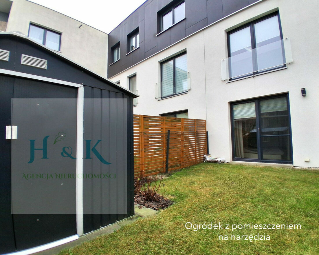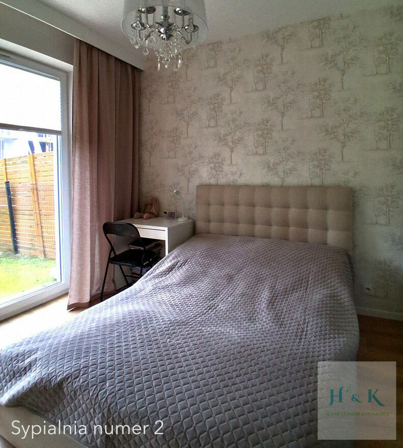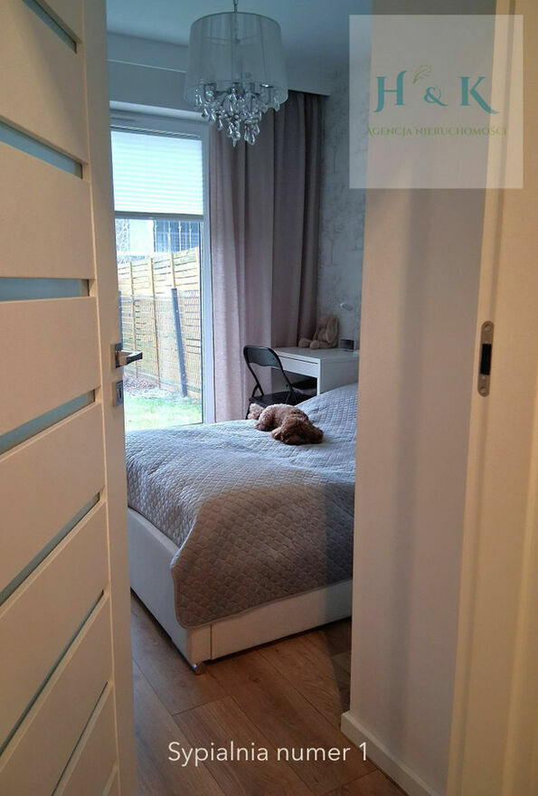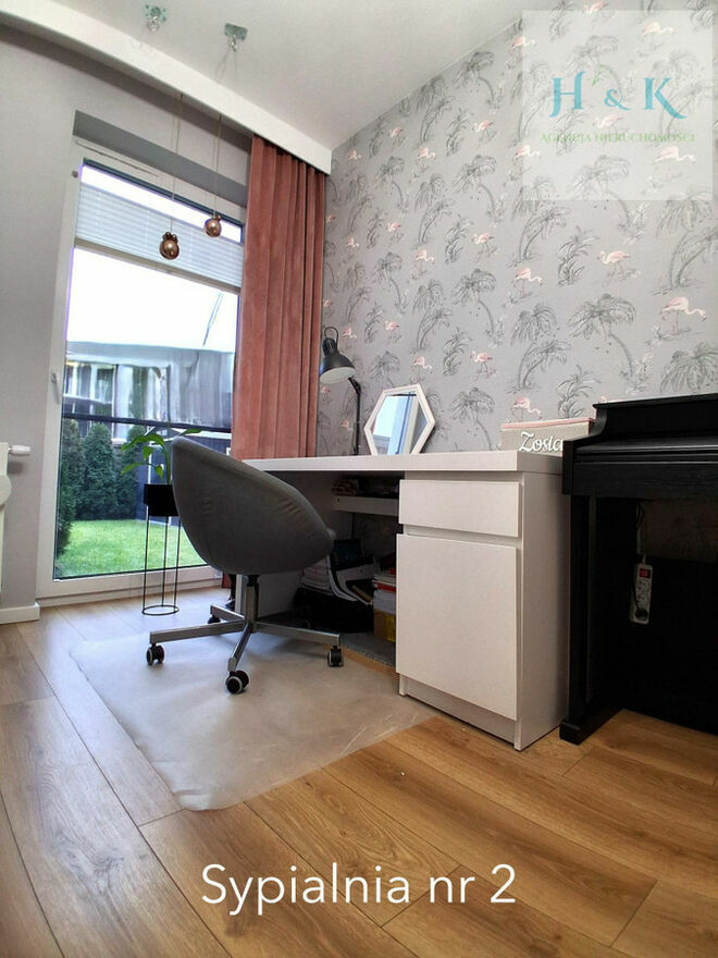 Sypialnia położona jest w części mieszkania (dalszej od drogi osiedlowej), gdzie ogródek styka się z ogrodem sąsiadów, co zapewnia ciszę i intymność (znaczne oddalenie sąsiedniego budynku). Ogródki zadbane, mały budynek gospodarczy.