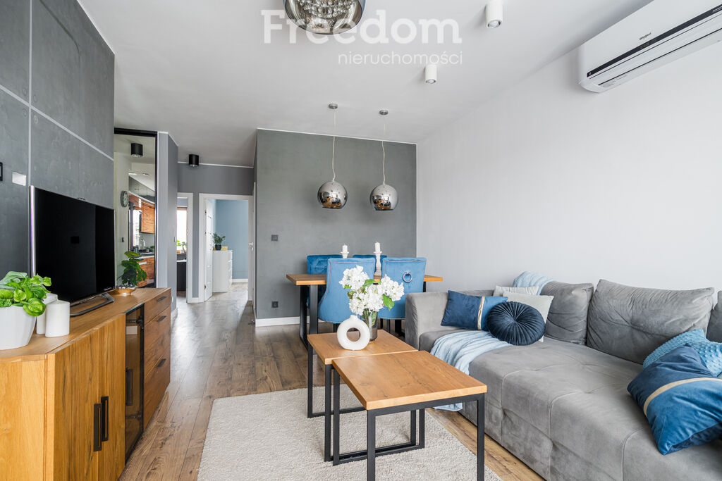Jasny salon z wyraźnie wydzieloną kuchnią - dzięki temu salon jest