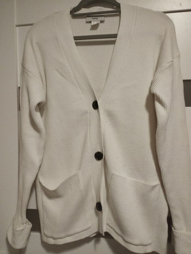 Sweter damski młodzieżowy typu kardigan zapinany na guziki z kieszeniami firmy Heine. Kolor biały ciepły i wygodny. Rozmiar 40/42 szerokość pod pachami 55 x 2 bez rozciągania, długość całkowita 68 cm. Nowy bez metki papierowej.Dagmara