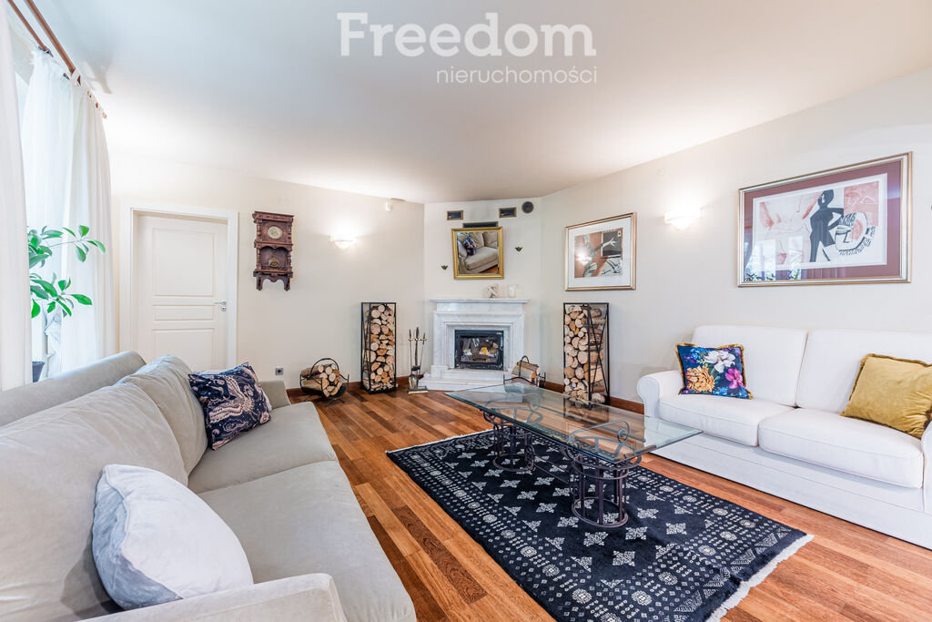 przestronny salon z wyjściem na taras i kominkiem.
